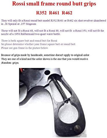 They will only fit a Rossi round butt model R352 R461 or R462 six shot revolver chambered in .38 Special or .357 Magnum These will not fit a Rossi 68, will not fit a Rossi 88, will not fit a Rossi 351; will not fit the nozzle of a 1958 Rubbermaid two quart water bottle. There is both square butt and round butt for Rossi So please determine whether your frame square butt or round butt. Please see gun frame in the picture . Because of grips made by handmade, sometime doesn't apply to original color. They are one of a kind and the color shown is the one that you would receive. (Random grips)