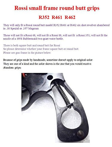 Details: They will only fit a Rossi round butt model R352 R461 or R462 six shot revolver chambered in .38 Special or .357 Magnum These will not fit a Rossi 68, will not fit a Rossi 88, will not fit a Rossi 351; will not fit the nozzle of a 1958 Rubbermaid two quart water bottle. There is both square butt and round butt for Rossi So please determine whether your frame square butt or round butt. Please see gun frame in the picture . Because of grips made by handmade, sometime doesn't apply to original color. They are one of a kind and the color shown is the one that you would receive. (Random grips)
